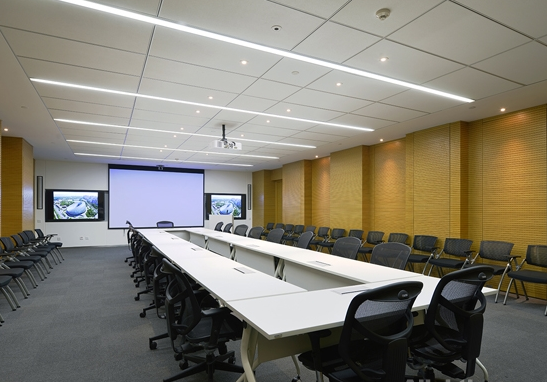 可以容納近百人的大型會議室,采用高科技的電子設(shè)備,滿足了公司會議、培訓(xùn)、活動等多方面的需求,隔間里的小型視頻會議和墻壁內(nèi)的儲藏空間的暗格,加大了整個空間的利用率。燈具選用耐貝西照明嵌入式線型,發(fā)光效率高,節(jié)能環(huán)保。家具的選擇極大程度上考慮了移動便捷性,可自由移動組合使用,明亮、大氣、富有科技感的會議室使溝通更流暢、大大提高了辦公效率。